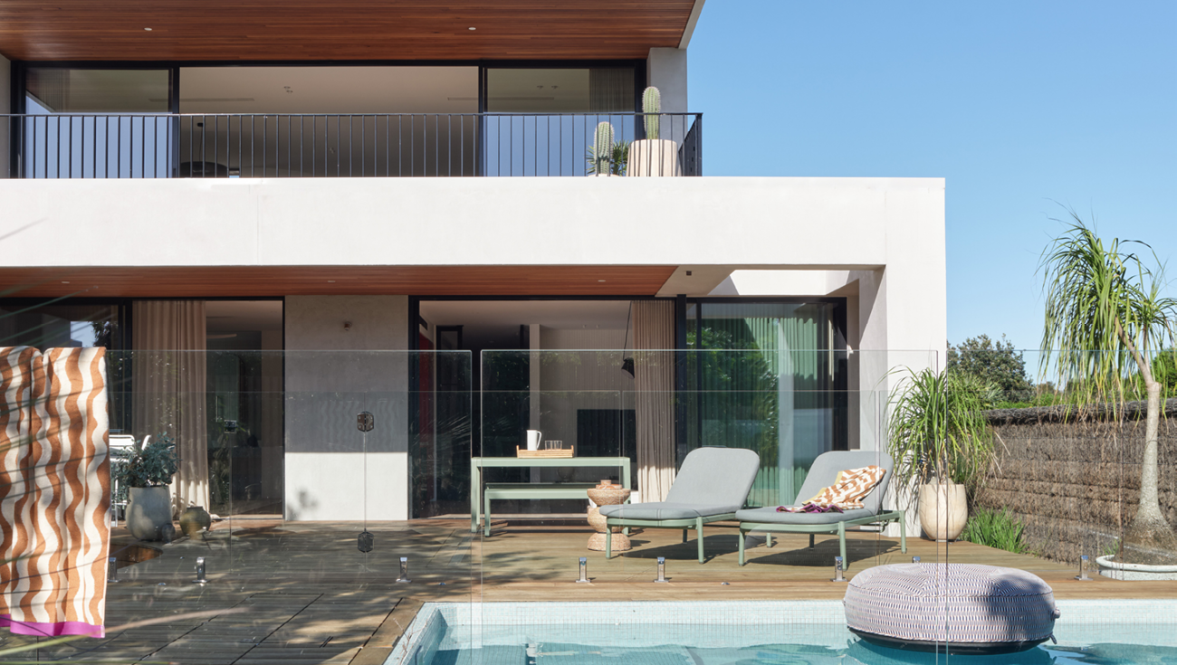 This Byron Bay home blends beachside bliss with family life, resulting in a stunning exterior, inviting interior, and fun outdoor pool space.