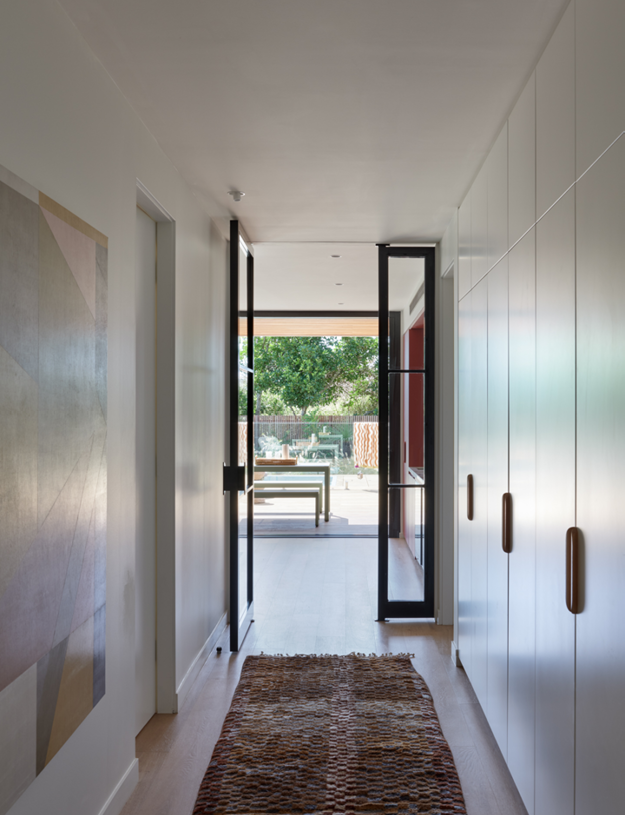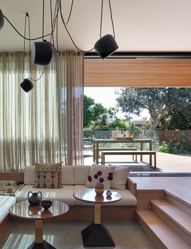 Milton designed a minimalist exterior that opens to a home that features spaces for gathering and places to retreat. The hero is a sunken lounge pit where everyone can kick back and catch up after a day by the pool or the beach.